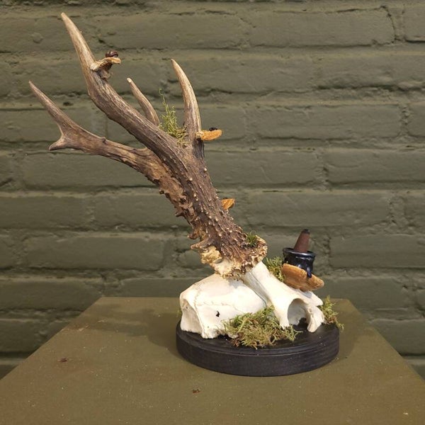 Wierookhouder met ree schedel gedecoreert met paddestoelen en kevertjes. Wierook komt onder uit de schedel